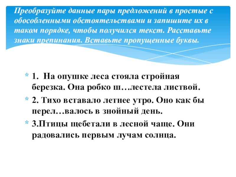 Преобразуйте данные пары предложений в простые с обособленными обстоятельствами и запишите их в таком порядке, чтобы получился текст. Расставьmе знаки препинания. Вставьте пропущенные буквы.