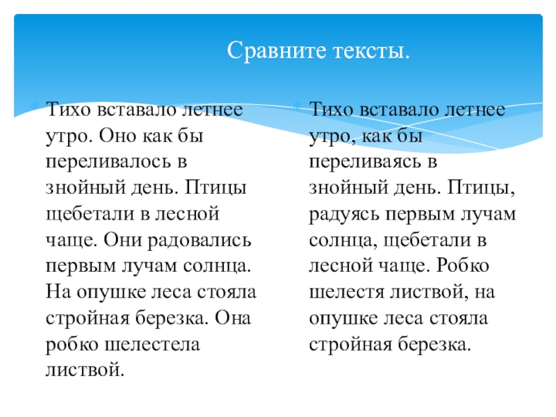 Тихо вставало летнее утро, как бы переливаясь в знойный день. Птицы, радуясь первым лучам солнца, щебетали в лесной чаще. Робко шелестя листвой, на опушке леса стояла стройная березка.