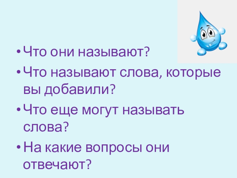 Что они называют?Что называют слова, которые вы добавили?Что еще могут называть слова?На какие вопросы они отвечают?