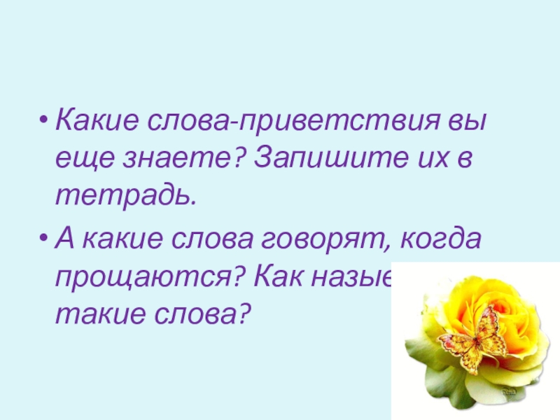 Слайд 6Какие слова-приветствия вы еще знаете? Запишите их в тетрадь.