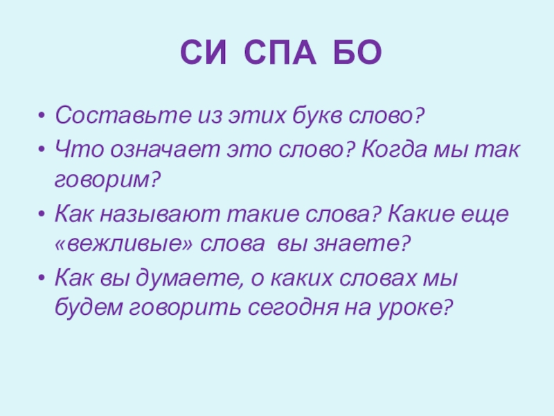 СИ СПА БОСоставьте из этих букв слово?Что означает это слово? Когда мы так говорим?Как называют такие