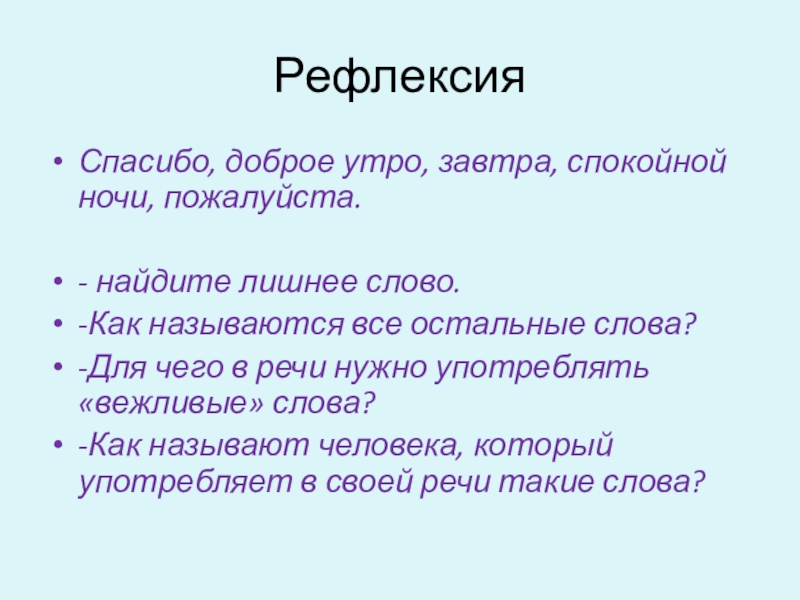 Рефлексия Спасибо, доброе утро, завтра, спокойной ночи, пожалуйста. - найдите лишнее слово.-Как называются все остальные слова?-Для чего