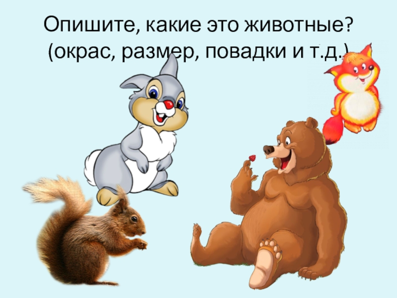 Слайд 2Опишите, какие это животные? (окрас, размер, повадки и т.д.)