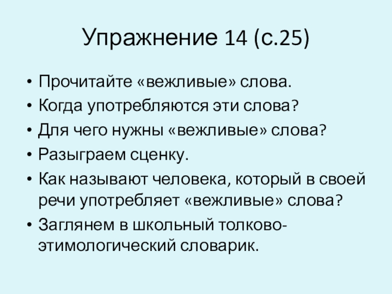 Упражнение 14 (с.25)Прочитайте «вежливые» слова. Когда употребляются эти слова?Для чего нужны «вежливые» слова?Разыграем сценку.Как называют человека, который