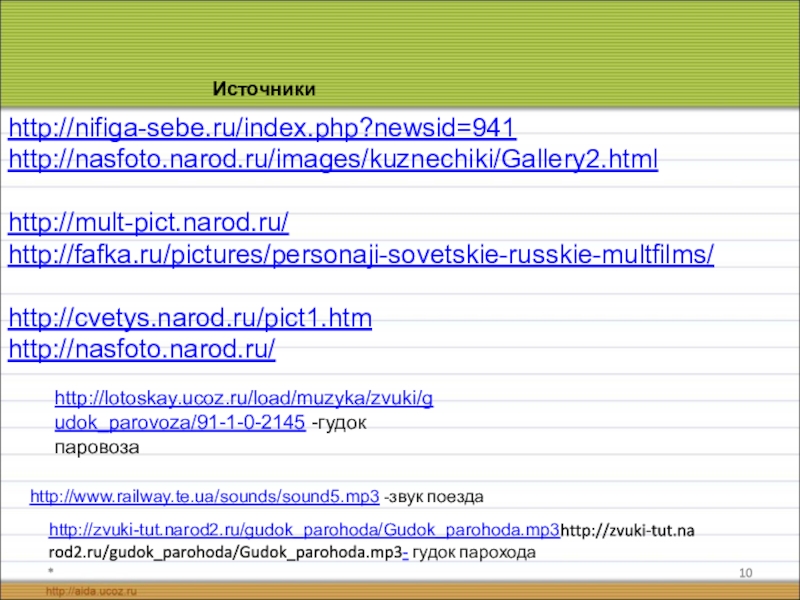 *http://nifiga-sebe.ru/index.php?newsid=941http://nasfoto.narod.ru/images/kuznechiki/Gallery2.html http://mult-pict.narod.ru/ http://fafka.ru/pictures/personaji-sovetskie-russkie-multfilms/ http://cvetys.narod.ru/pict1.htmhttp://nasfoto.narod.ru/Источникиhttp://lotoskay.ucoz.ru/load/muzyka/zvuki/gudok_parovoza/91-1-0-2145 -гудок паровозаhttp://www.railway.te.ua/sounds/sound5.mp3 -звук поездаhttp://zvuki-tut.narod2.ru/gudok_parohoda/Gudok_parohoda.mp3http://zvuki-tut.narod2.ru/gudok_parohoda/Gudok_parohoda.mp3- гудок парохода