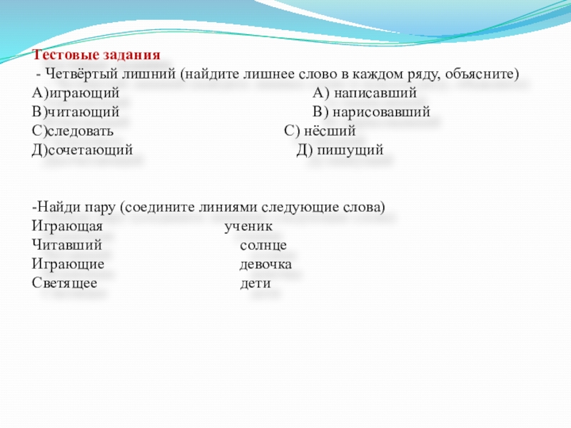 Тестовые задания - Четвёртый лишний (найдите лишнее слово в каждом ряду, объясните) А)играющий