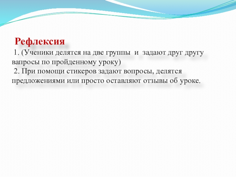 Рефлексия  1. (Ученики делятся на две группы и задают друг другу вапросы по пройденному уроку)