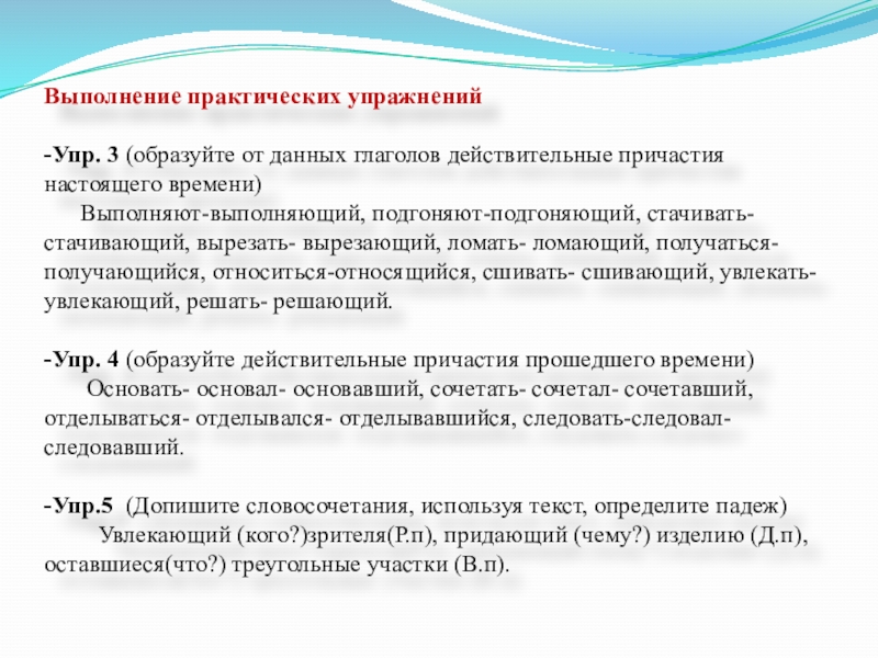времени) Выполняют-выполняющий, подгоняют-подгоняющий, стачивать- стачивающий, вырезать- вырезающий, ломать- ломающий, получаться-получающийся, относиться-относящийся, сшивать- сшивающий, увлекать- увлекающий, решать- решающий.   -Упр. 4 (образуйте действительные причастия прошедшего времени) Основать- основал- основавший, сочетать- сочетал- сочетавший, отделываться- отделывался- отделывавшийся, следовать-следовал-следовавший.   -Упр.5 (Допишите словосочетания, используя текст, определите падеж) Увлекающий (кого?)зрителя(Р.п), придающий (чему?) изделию (Д.п), оставшиеся(что?) треугольные участки (В.п).