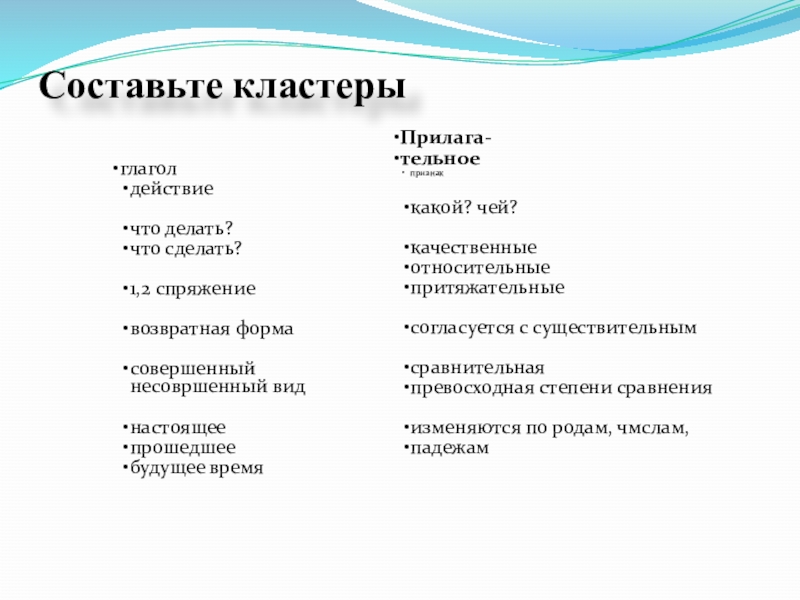 Что такое глагол?  Признаки глагола?  Что такое прилагательное?  Как изменяются прилагательные?