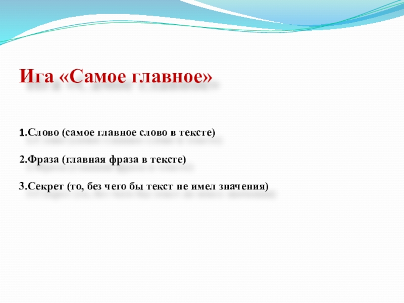 Слайд 8Ига «Самое главное» 1.Слово (самое главное слово в тексте) 2.Фраза (главная фраза в