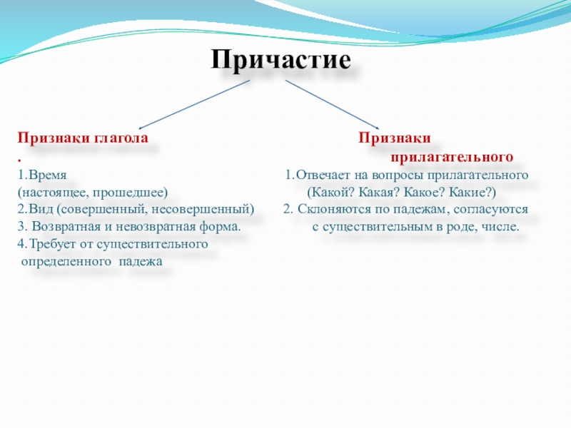 Причастие Признаки глагола Признаки . прилагательного 1.Время 1.Отвечает на вопросы прилагательного (настоящее, прошедшее) (Какой? Какая? Какое? Какие?) 2.Вид (совершенный, несовершенный) 2. Склоняются по падежам, согласуются 3. Возвратная и невозвратная форма. с существительным в роде, числе. 4.Требует от существительного определенного падежа