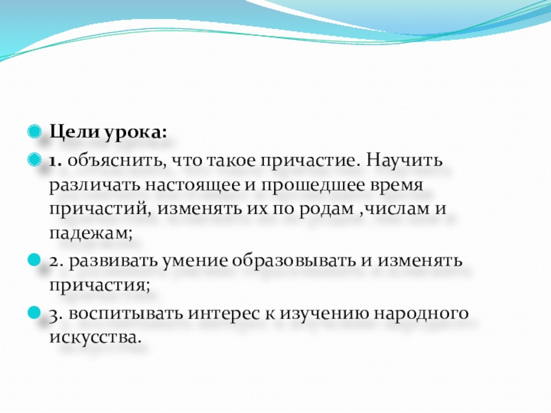 Цели урока: 1. объяснить, что такое причастие. Научить различать настоящее и прошедшее время причастий, изменять их по родам ,числам и падежам;2. развивать умение образовывать и изменять причастия;3. воспитывать интерес к изучению народного искусства.