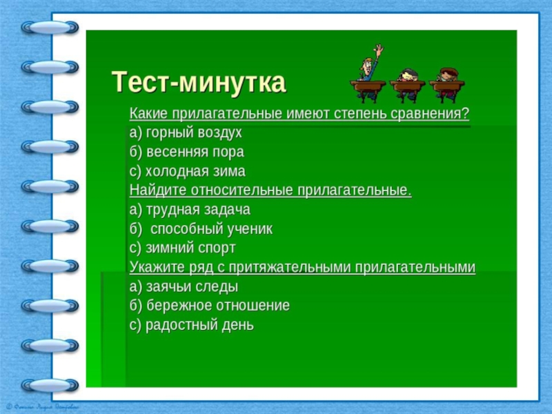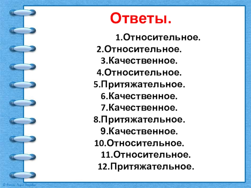 Ответы.1.Относительное.2.Относительное.3.Качественное.4.Относительное.5.Притяжательное.6.Качественное.7.Качественное.8.Притяжательное.9.Качественное.10.Относительное.   11.Относительное.   12.Притяжательное.