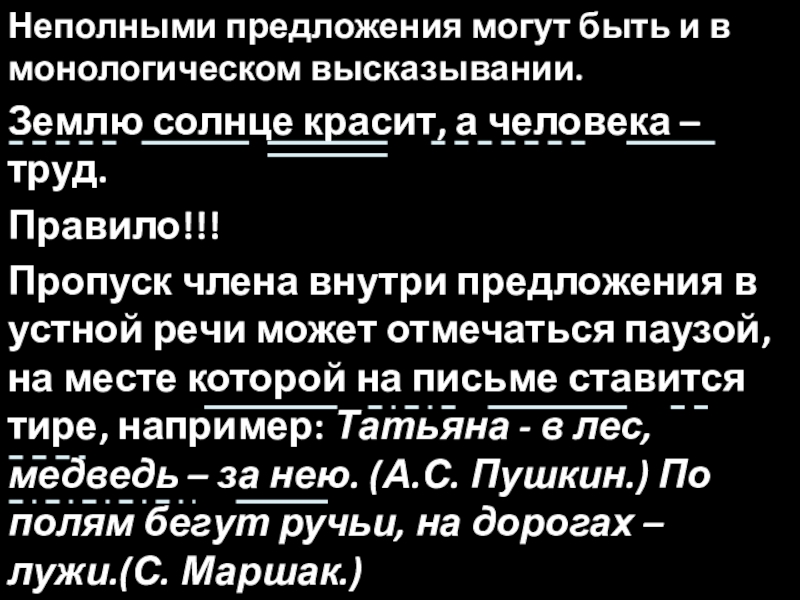 Неполными предложения могут быть и в монологическом высказывании.Землю солнце красит, а человека – труд.Правило!!!Пропуск члена внутри предложения
