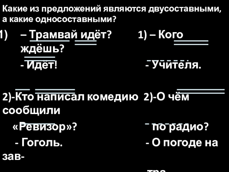 Какие из предложений являются двусоставными, а какие односоставными?– Трамвай идёт?     1) – Кого