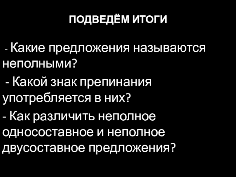 ПОДВЕДЁМ ИТОГИ - Какие предложения называются неполными? - Какой знак препинания употребляется в них?- Как различить неполное