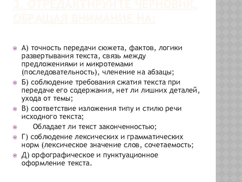 3. Отредактируйте черновик, обращая внимание на: А) точность передачи сюжета, фактов, логики развертывания текста, связь между предложениями