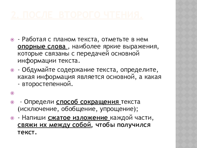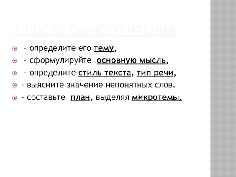 1.После первого чтения: - определите его тему, - сформулируйте основную мысль, - определите стиль текста, тип речи, - выясните значение непонятных слов.- составьте план, выделяя микротемы.
