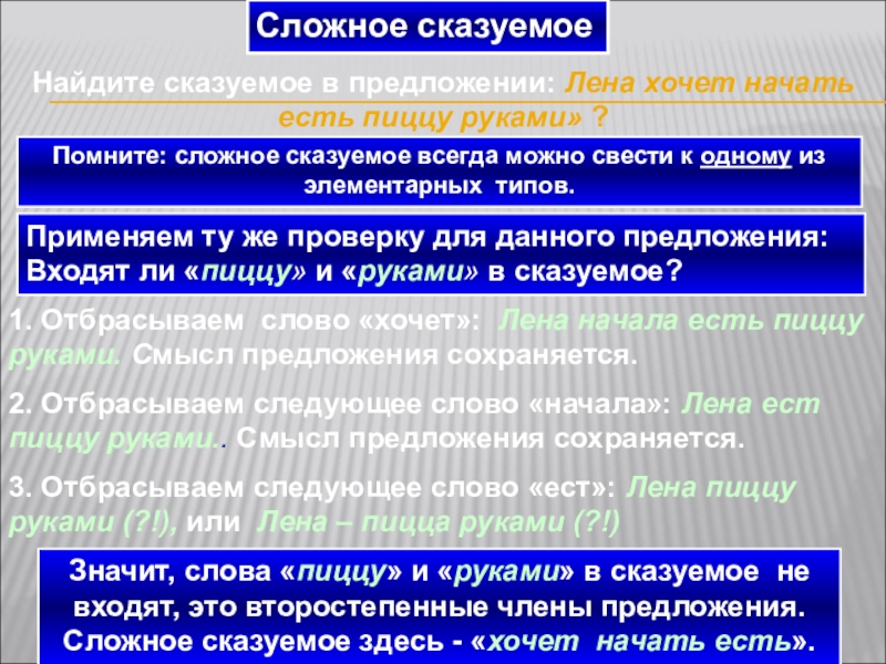 1. Отбрасываем слово «хочет»: Лена начала есть пиццу руками. Смысл предложения сохраняется.