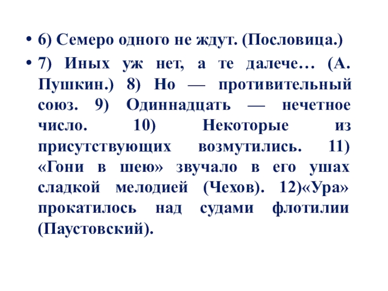 6) Семеро одного не ждут. (Пословица.)7) Иных уж нет, а те далече… (А. Пушкин.) 8) Но —