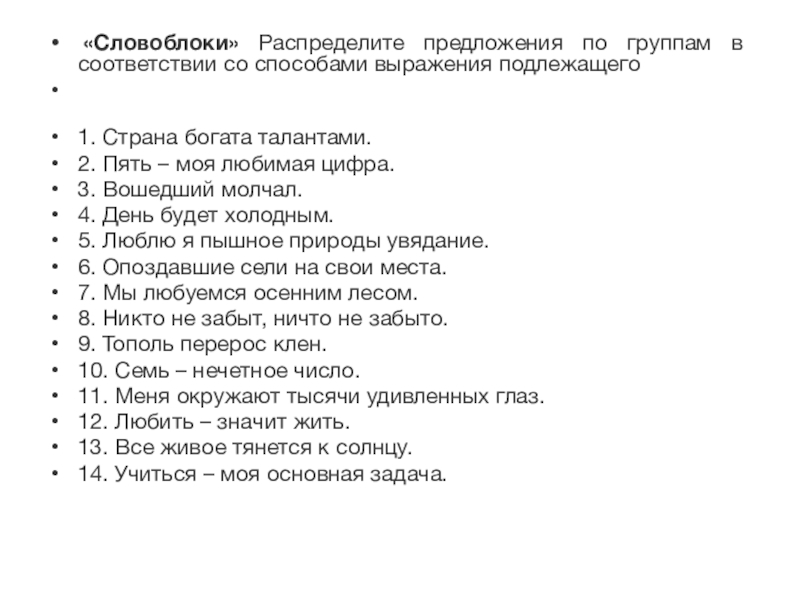 «Словоблоки» Распределите предложения по группам в соответствии со способами выражения подлежащего  1. Страна богата талантами.2. Пять