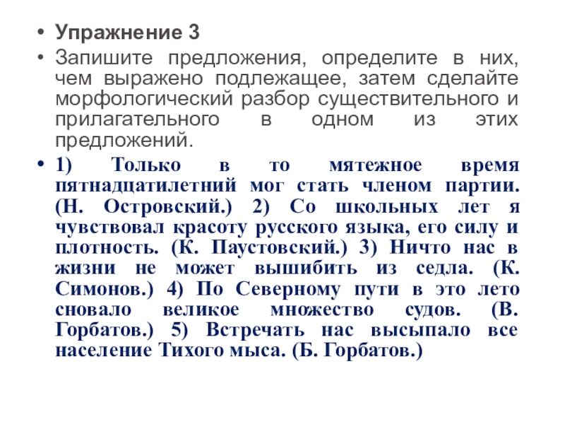 Упражнение 3Запишите предложения, определите в них, чем выражено подлежащее, затем сделайте морфологический разбор существительного и прилагательного в