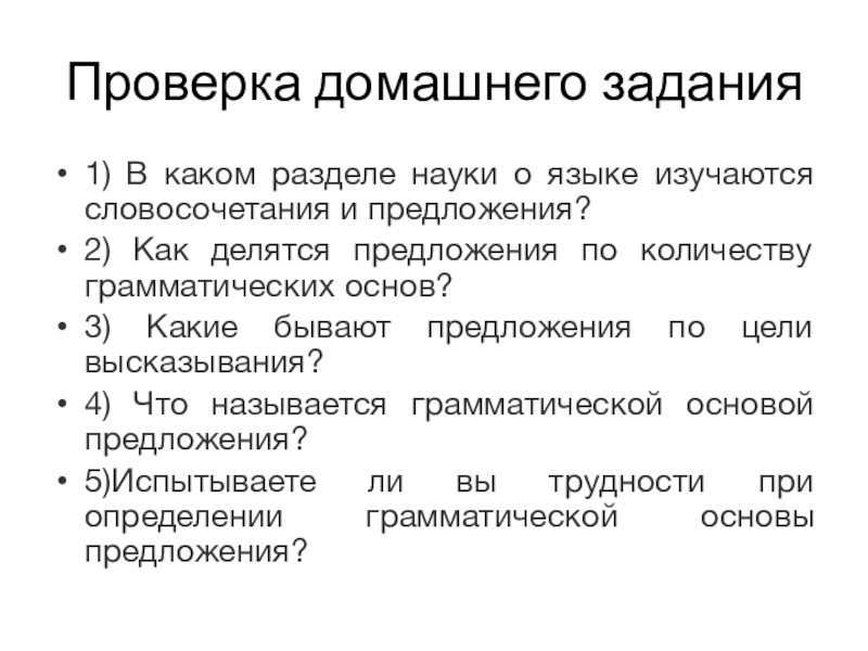 Проверка домашнего задания1) В каком разделе науки о языке изучаются словосочетания и предложения? 2) Как делятся предложения по количеству грамматических основ? 3) Какие бывают предложения по цели высказывания?4) Что называется грамматической основой предложения?5)Испытываете ли вы трудности