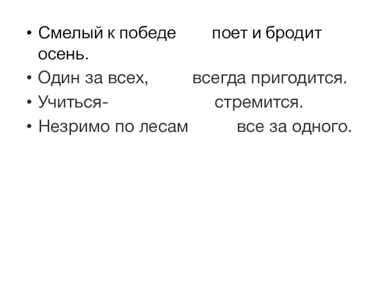 Смелый к победе     поет и бродит осень.Один за всех,       всегда пригодится.Учиться-