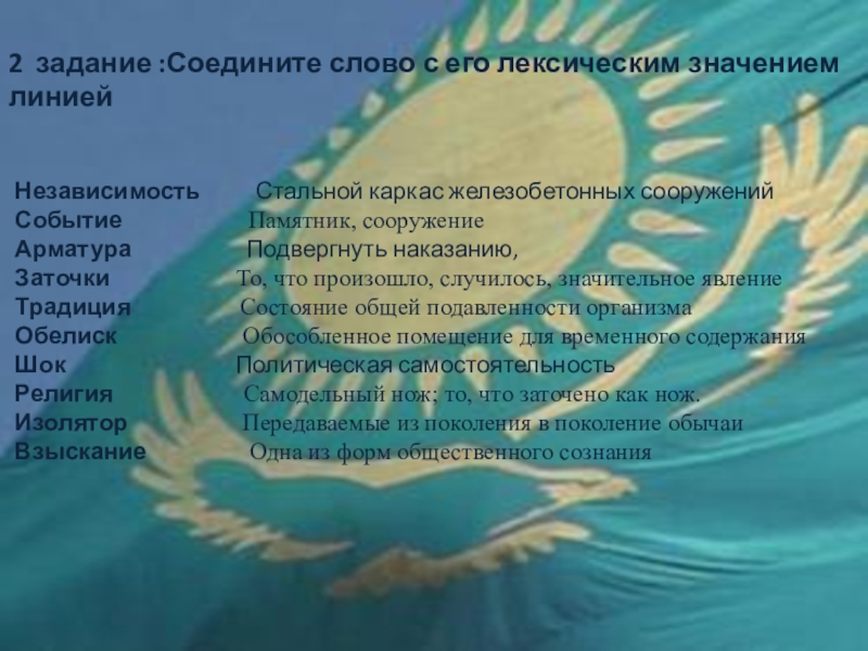 2 задание :Соедините слово с его лексическим значением линиейНезависимость     Стальной каркас железобетонных сооружений