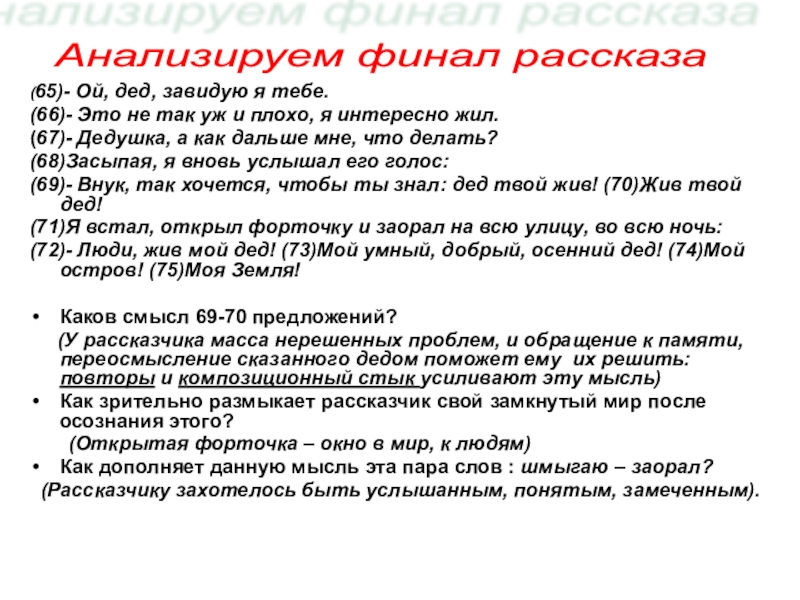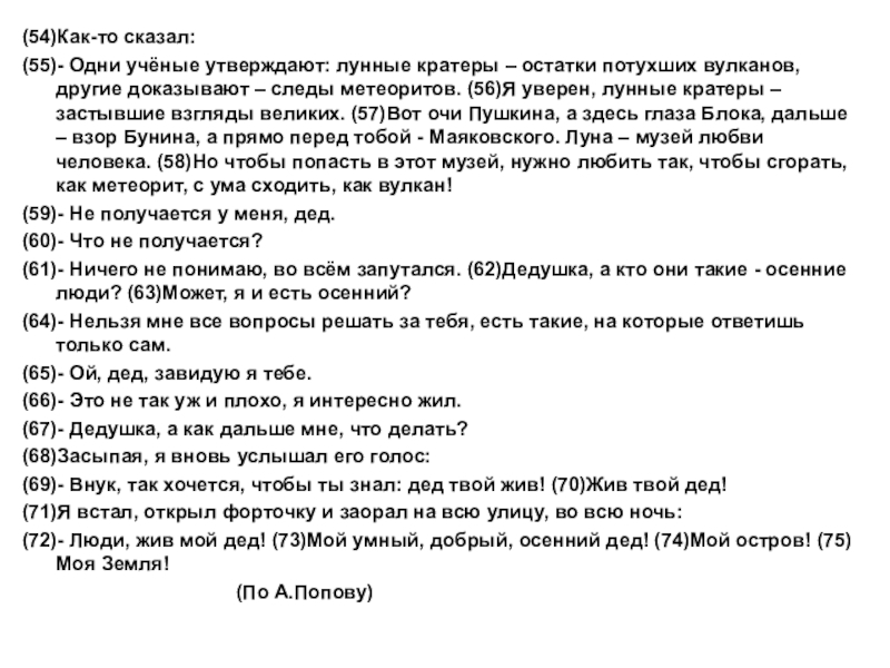 (72)- Люди, жив мой дед! (73)Мой умный, добрый, осенний дед! (74)Мой остров! (75)Моя Земля!