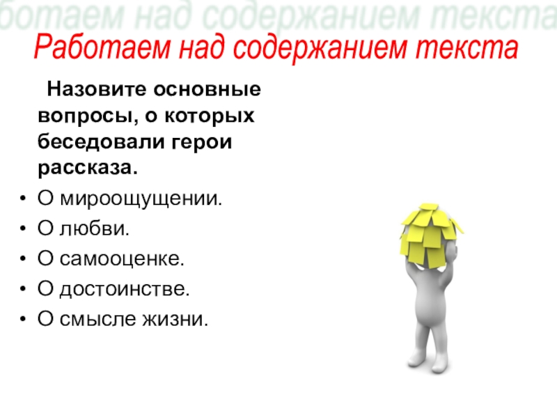 Слайд 6 Назовите основные вопросы, о которых беседовали герои рассказа.