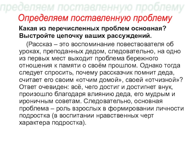 (Рассказ – это воспоминание повествователя об уроках, преподанных дедом, следовательно, на одно из первых мест выходит проблема бережного отношения к памяти о своём прошлом. Однако тогда следует спросить, почему рассказчик помнит деда, считает его своим «отчим домой», своей «отчизной»? Ответ очевиден: всё, чего достиг и достигнет внук, произошло благодаря влиянию деда, его мудрым и ироничным советам. Следовательно, основная проблема – роль взрослых в формировании личности подростка (в воспитании нравственных черт характера подростка).