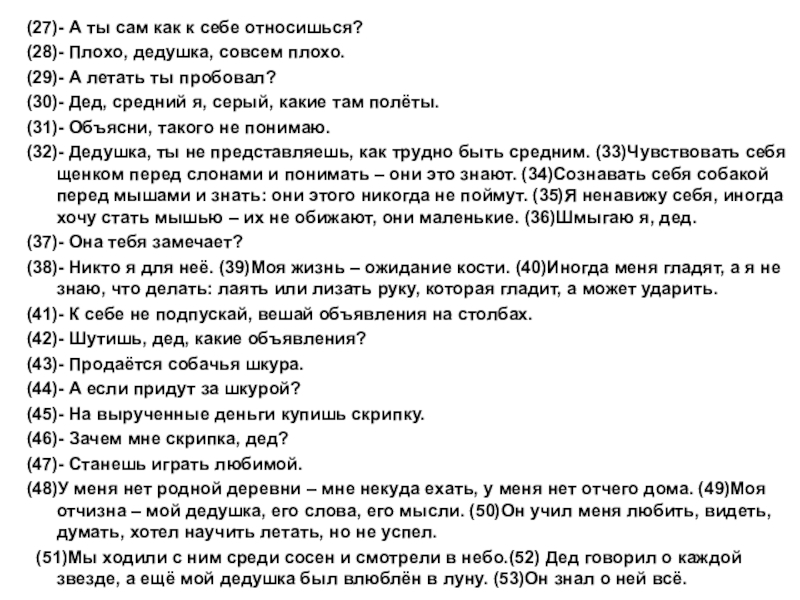 (48)У меня нет родной деревни – мне некуда ехать, у меня нет отчего дома. (49)Моя отчизна – мой дедушка, его слова, его мысли. (50)Он учил меня любить, видеть, думать, хотел научить летать, но не успел.