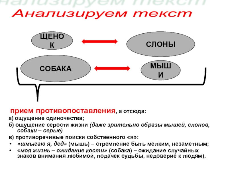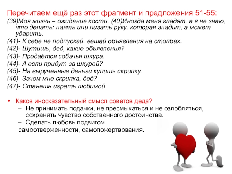 (38)- Никто я для неё. (39)Моя жизнь – ожидание кости. (40)Иногда меня гладят, а я не знаю, что делать: лаять или лизать руку, которая гладит, а может ударить.