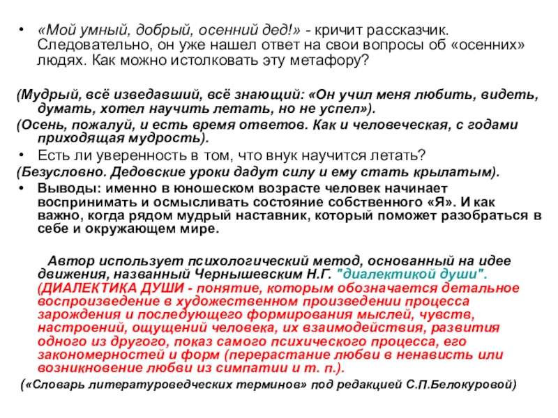 Слайд 21«Мой умный, добрый, осенний дед!» - кричит рассказчик. Следовательно, он уже