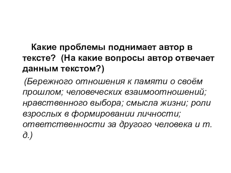(Бережного отношения к памяти о своём прошлом; человеческих взаимоотношений; нравственного выбора; смысла жизни; роли взрослых в формировании личности; ответственности за другого человека и т.д.)