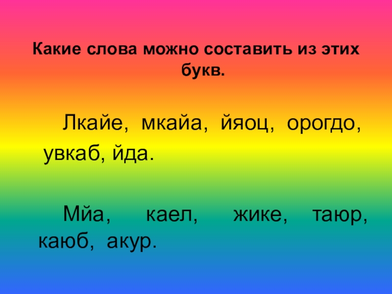 Какие слова можно составить из этих букв.		Лкайе, мкайа, йяоц, орогдо,	увкаб, йда. 		Мйа,  каел,  жике, таюр,