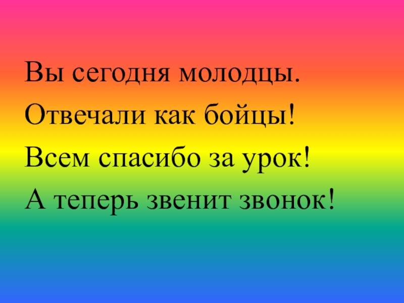 Вы сегодня молодцы.Отвечали как бойцы!Всем спасибо за урок!А теперь звенит звонок!