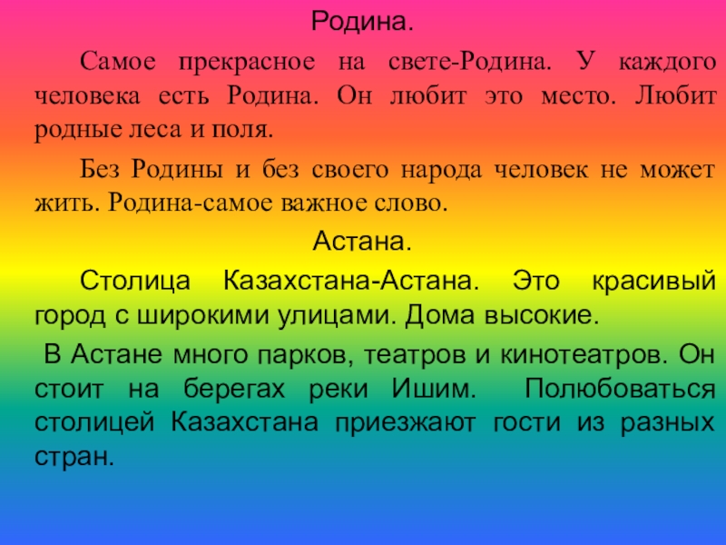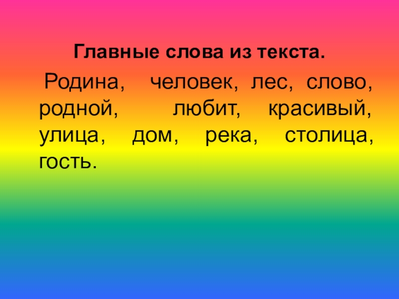 Главные слова из текста.	Родина, человек, лес, слово, родной, любит, красивый, улица, дом, река, столица, гость.