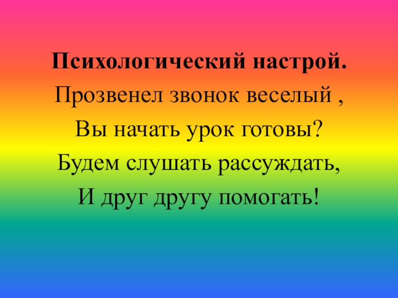 Психологический настрой.Прозвенел звонок веселый ,Вы начать урок готовы?Будем слушать рассуждать, И друг другу помогать!