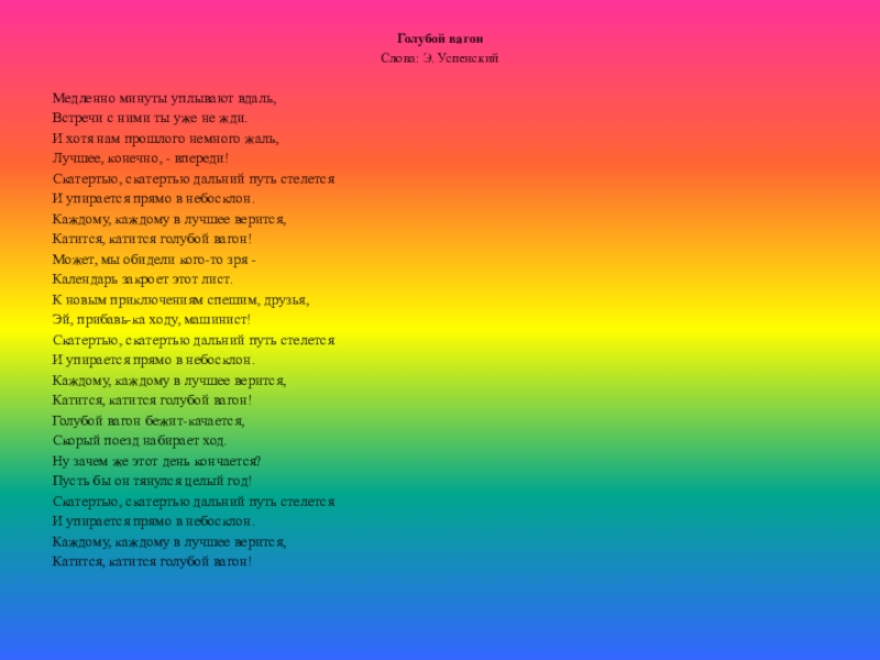 Голубой вагонСлова: Э. Успенский Медленно минуты уплывают вдаль, Встречи с ними ты уже не жди. И хотя