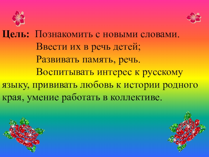 Цель: Познакомить с новыми словами. Ввести их в речь детей; Развивать память, речь. Воспитывать интерес к русскому языку,