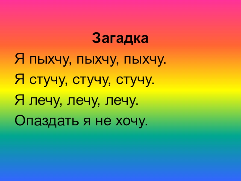 Загадка Я пыхчу, пыхчу, пыхчу.Я стучу, стучу, стучу.Я лечу, лечу, лечу.Опаздать я не хочу.