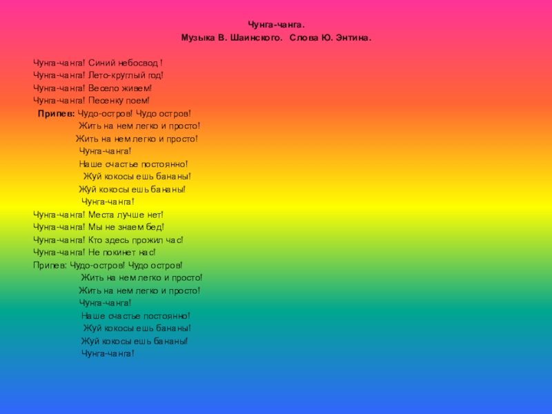Чунга-чанга.Музыка В. Шаинского.  Слова Ю. Энтина.Чунга-чанга! Синий небосвод !Чунга-чанга! Лето-круглый год!Чунга-чанга! Весело живем!Чунга-чанга! Песенку поем! Припев: