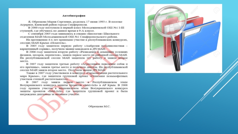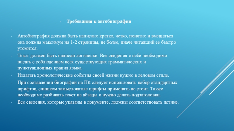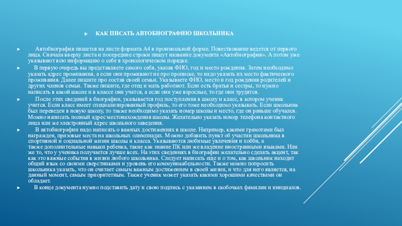 Автобиография должна быть написано кратко, четко, понятно и вмещаться