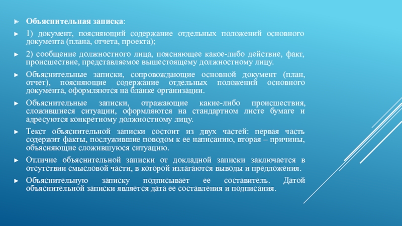Объяснительные записки, отражающие какие-либо происшествия, сложившиеся ситуации, оформляются на стандартном листе бумаге и адресуются конкретному должностному лицу.