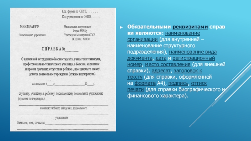 Слайд 17Обязательными реквизитами справки являются: наименование организации (для внутренней – наименование структурного подразделения), наименование вида документа, дата и регистрационный номер, место
