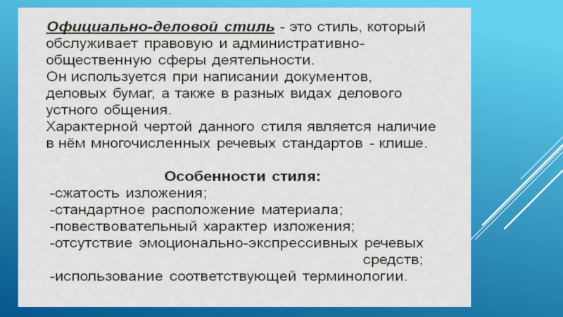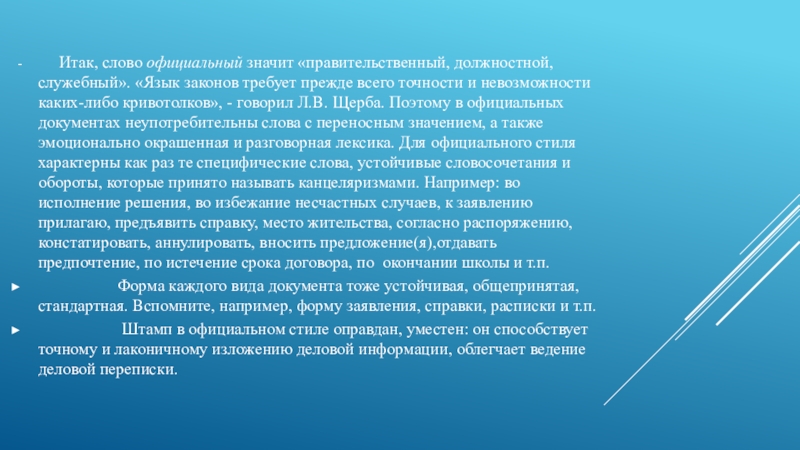 законов требует прежде всего точности и невозможности каких-либо кривотолков», - говорил Л.В. Щерба. Поэтому в официальных документах неупотребительны слова с переносным значением, а также эмоционально окрашенная и разговорная лексика. Для официального стиля характерны как раз те специфические слова, устойчивые словосочетания и обороты, которые принято называть канцеляризмами. Например: во исполнение решения, во избежание несчастных случаев, к заявлению прилагаю, предъявить справку, место жительства, согласно распоряжению, констатировать, аннулировать, вносить предложение(я),отдавать предпочтение, по истечение срока договора, по окончании школы и т.п.