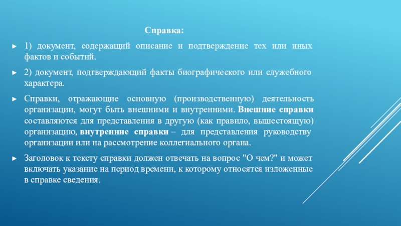 Справки, отражающие основную (производственную) деятельность организации, могут быть внешними и внутренними. Внешние справки составляются для представления в другую (как правило, вышестоящую) организацию, внутренние справки – для представления руководству организации или на рассмотрение коллегиального органа.