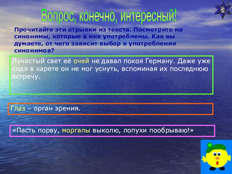 Прочитайте эти отрывки из текста. Посмотрите на синонимы, которые в них употреблены. Как вы думаете, от чего зависит выбор в употреблении синонимов?